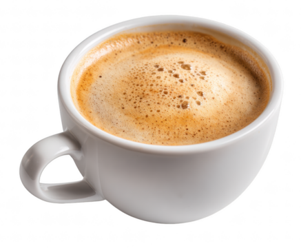 Aromatic espresso coffee in a white cup isolated on transparent background, rich crema and swirling pattern for cafe menu and beverage design