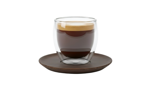 Double Walled Glass Coffee Cup with Espresso on Wooden Saucer