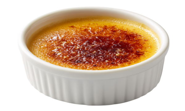 Crème brûlée in a ramekin isolated on transparent background, classic French dessert with caramelized sugar crust, custard treat