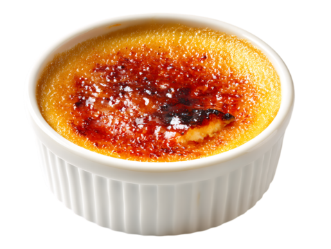 Creme Brulee Dessert in White Ramekin with Torched Sugar Top custard isolated on a transparent background