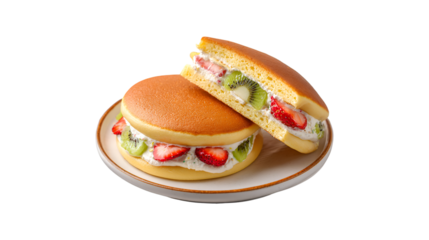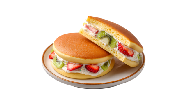 Fluffy Japanese pancakes filled with whipped cream fresh strawberries and kiwi one cut in half on a rustic plate