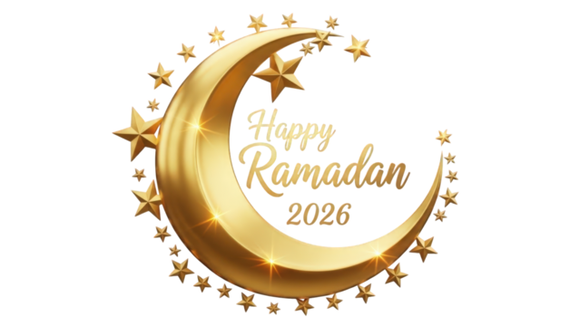 Happy ramadan 2026 greeting with golden crescent moon and stars isolated on transparent background