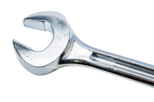 Shiny silver open end wrench, suitable for construction, automotive, and DIY maintenance projects, isolated on a white background.