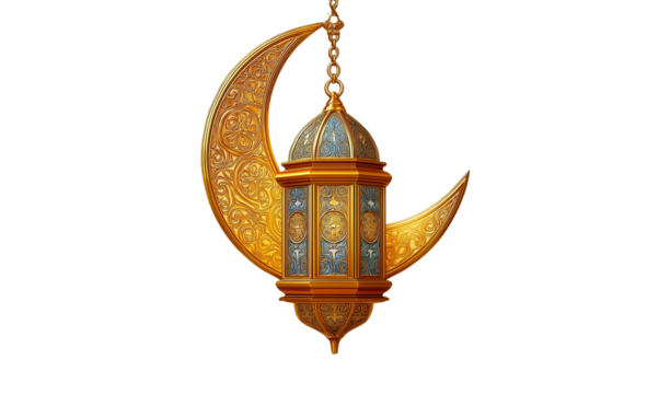 Golden Crescent Moon with Decorative Lantern Keywords: Ramadan, Islamic, moon, crescent, lantern isolated on a transparent background
