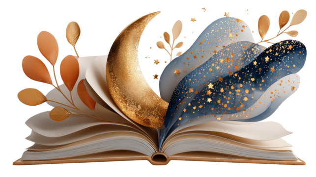 Open book with golden crescent moon and swirling colorful elements, creating a magical atmosphere of imagination and creativity. isolated image, transparent background