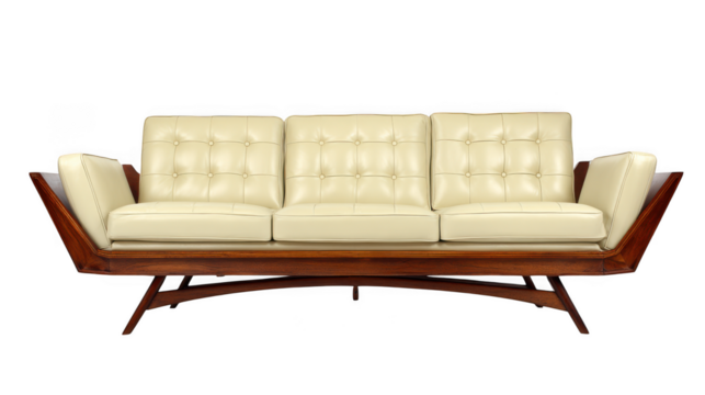 Elegant cream leather tufted three seater sofa with a rich wooden frame isolated on transparent background