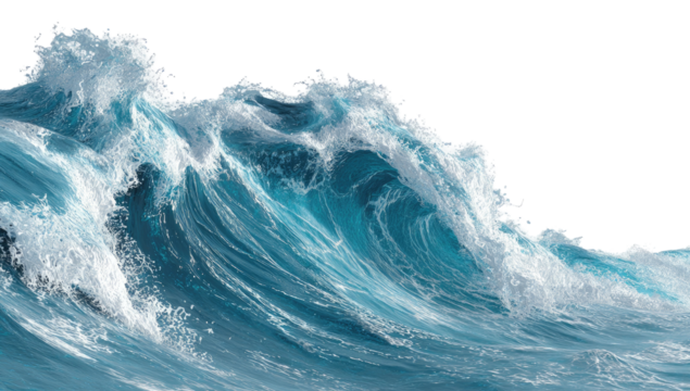 A powerful tsunami wave, cresting dramatically, isolated on a white background, representing natural forces and disaster.
