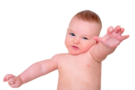 Infant baby reaches for a toy in a bed, mobile over a crib, isolated on a white background. Kid aged six months