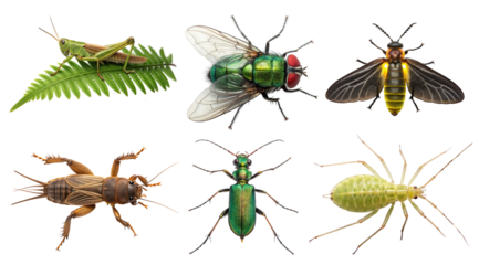 Various insects including a grasshopper, fly, firefly, cricket, beetle, and aphid isolated on transparent background