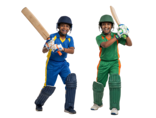 Two young boys in cricket uniforms with bats and helmets, smiling on white background