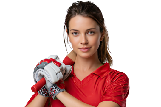 Confident Cricketer: A portrait of a woman cricketer, radiating confidence as she holds a cricket bat and gear, set against a bright, neutral background.
