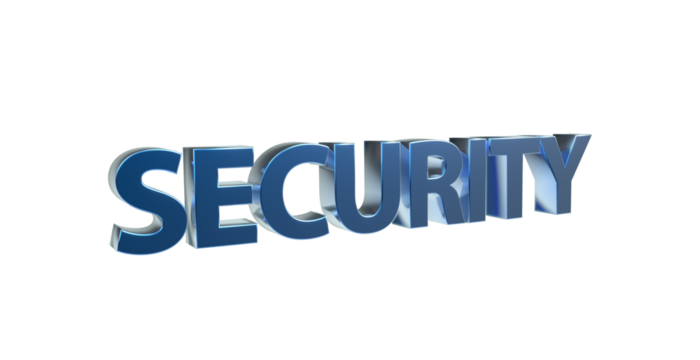 Security Sicherheit silberne plakative 3D-Schrift, Vertrauen, Schutz, Vorsorge, Gefahrenabwehr, Risikomanagement, Prävention, Sicherheitsmaßnahmen, Datenschutz,  Cybersecurity, Rendering, Freisteller
