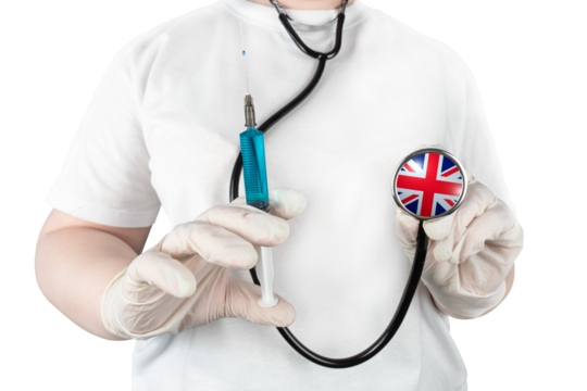 A healthcare worker holds a syringe with a vaccine and a stethoscope with a Union Jack on a transparent background. Conceptual representation of British healthcare, the National Health Service (NHS)