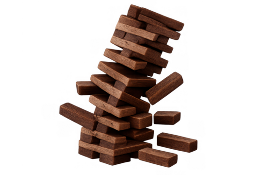 Wooden blocks collapsing, representing a domino effect, business risk, crisis, or losing balance. Transparent background