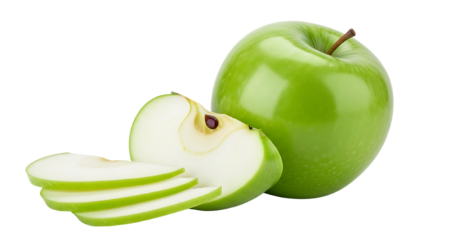 Two shiny green Granny Smith apples PNG isolated on transparent background, fresh fruit for healthy eating and cooking concepts