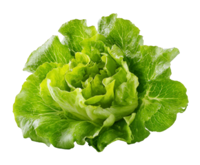 A fresh, vibrant green butter lettuce head, glistening with water droplets, isolated on a clean transparent background, showcasing its crisp texture and healthy appearance
