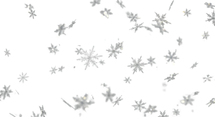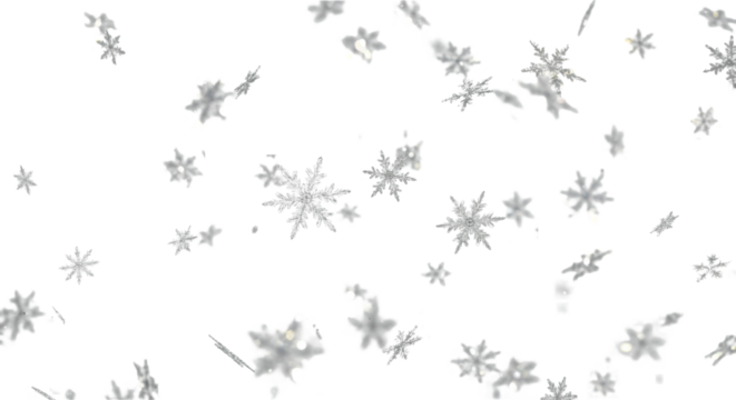 Delicate silver snowflakes with intricate crystalline structures gently falling on a transparent background, some sharp, some blurred with prominent bokeh, serene winter holidays concept