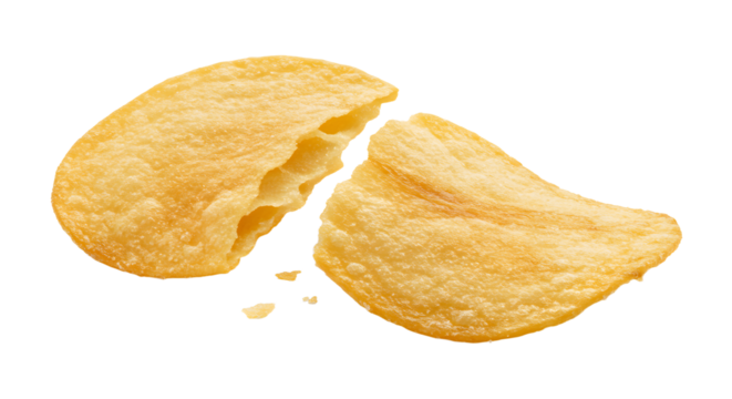 Close-up of a broken potato chip with crisp texture, highlighting its golden color against a white background