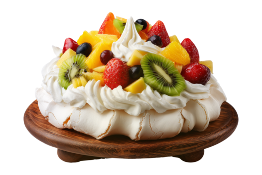 Australia pavlova Meringue dessert with crisp crust and fresh berries, fruits, and mint leaves, isolated on white transparent background
