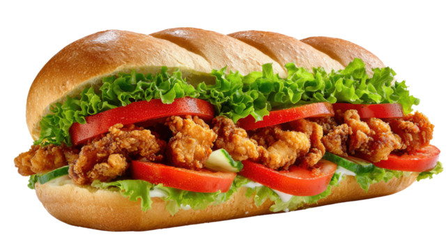 Savory Sub: A mouthwatering close-up of a fully loaded sub sandwich, featuring layers of crispy fried chicken, fresh tomatoes, crisp lettuce, and creamy spread nestled within a perfectly baked roll.