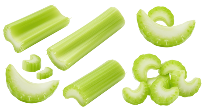 Fresh green celery stalks and curved slices on a transparent background, cut and arranged to show ribs, cross sections, and crisp texture