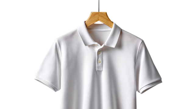 Elegant White Polo on Hanger: Clean, modern design of a white polo shirt suspended on a wooden hanger against a simple backdrop, evoking a sense of refined style.
