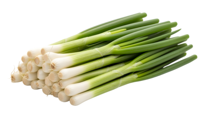 A close-up shot of a fresh bunch of green onions, showcasing crisp white bulb bases and vibrant green stalks