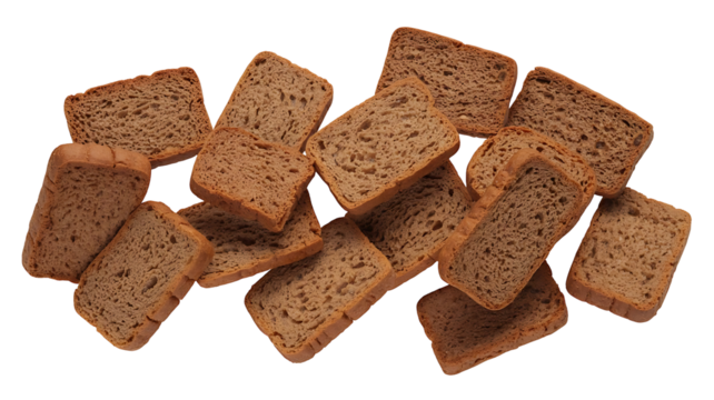 Pile of small rectangular pieces of dark rye crispbread or zwieback scattered on a transparent background isolated on transparent background