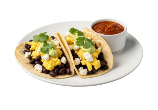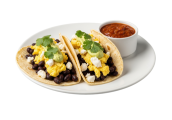 Two gourmet breakfast tacos with eggs, beans, queso, and salsa on white plate, transparent studio background. Appetizing food concept