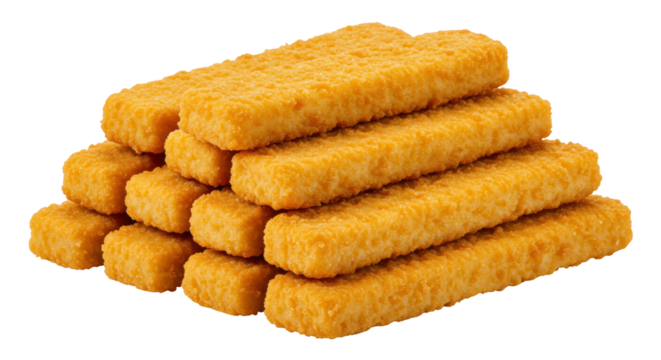 Pile of crispy breaded fish sticks isolated on transparent background, frozen seafood for fast food and convenience cooking