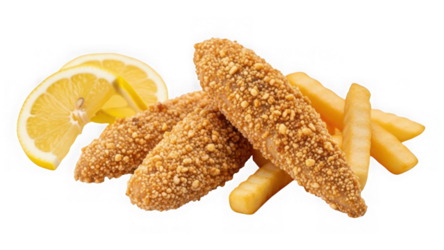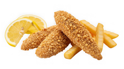 Crispy fish fillets and french fries with lemon slices isolated on transparent background