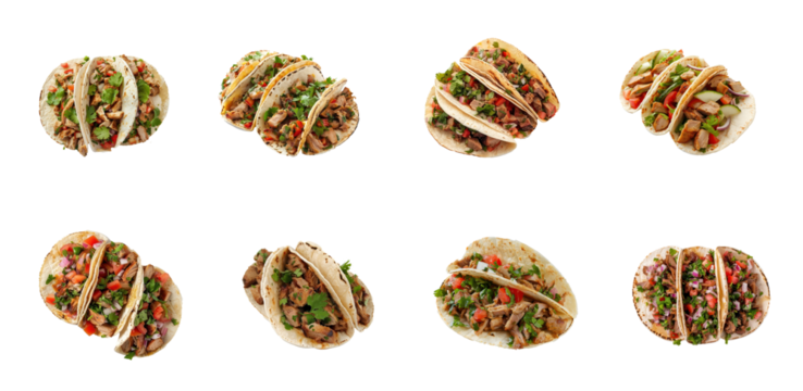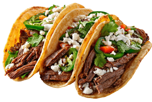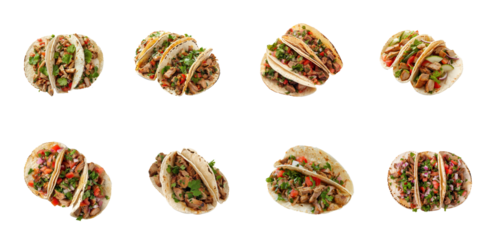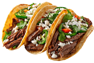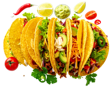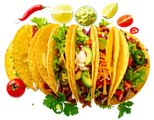 Authentic Mexican tacos with crispy shells and vibrant garnishes, isolated PNG