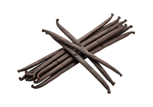 Close-up of vanilla beans arranged in a crisscross pattern against a black background