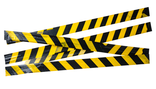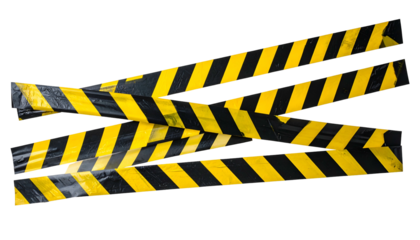 Yellow and black striped caution tape, crisscrossing against a background. This image evokes a sense of warning and danger, isolated on transparent background
