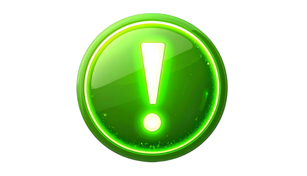 Glossy, green circular icon with a white exclamation point. Glowing effect against a black background