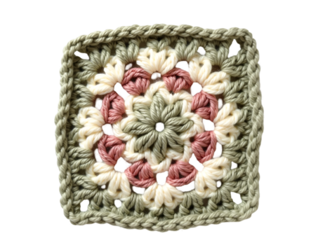 Detailed close up showcases the artistry in a hand stitched crochet granny square, highlighting the texture, design, and traditional craft technique