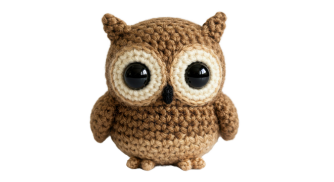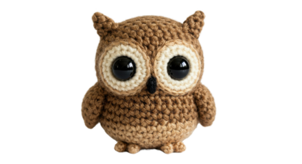 Three adorable crocheted owls, isolated on transparent background, showcasing their soft and charming features