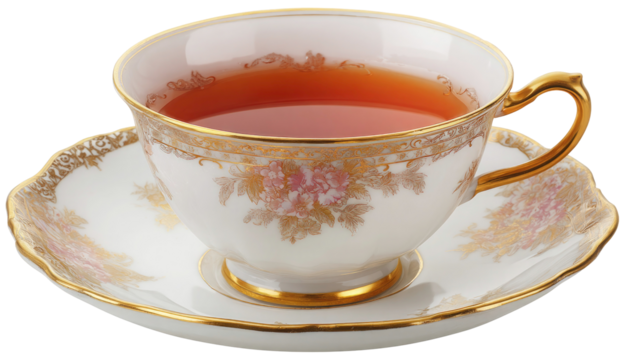 Teacup with hot tea and saucer, gold trim, and delicate floral pattern isolated on transparent background