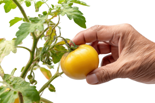 Mature asian hand picking yellow tomato from vine with green leaves, cut out