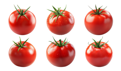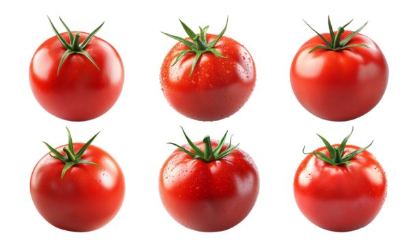 Fresh red tomatoes isolated on transparent background vibrant and detailed six views