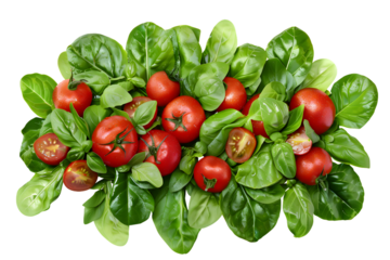 Fresh tomatoes and spinach leaves arranged in a vibrant and healthy assortment, ideal for salads and cooking.