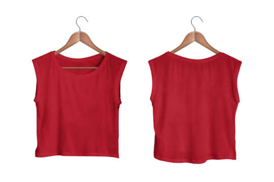 Women's Red Sleeveless Crop Top Front and Back View on Wooden Hanger
