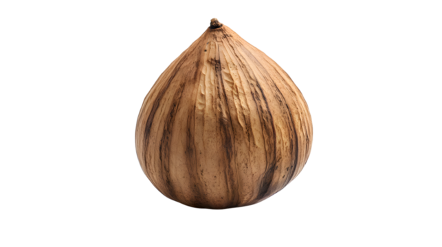 Close up of a single tiger nut against a stark black studio background shot on transparent background