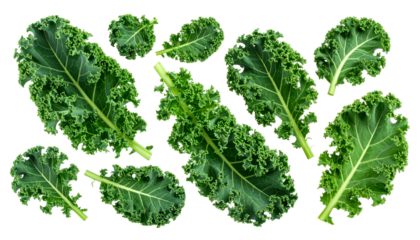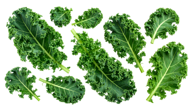 Overhead shot of green kale leaves, freshly harvested, arranged on a pure black background