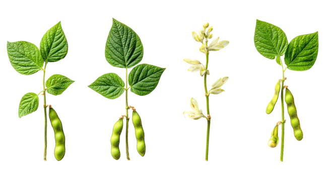 Four soybean plants showing leaves pods and flowers isolated on transparent background