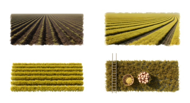 Set of A group of workers planting crops in a vast field with a large red truck parked nearby on transparent png background. Ai generated