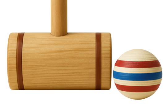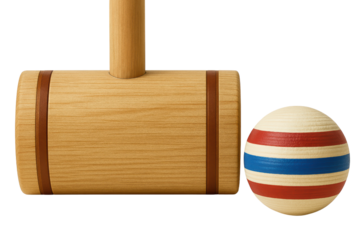Wooden croquet mallet and striped ball for an outdoor game on a transparent background