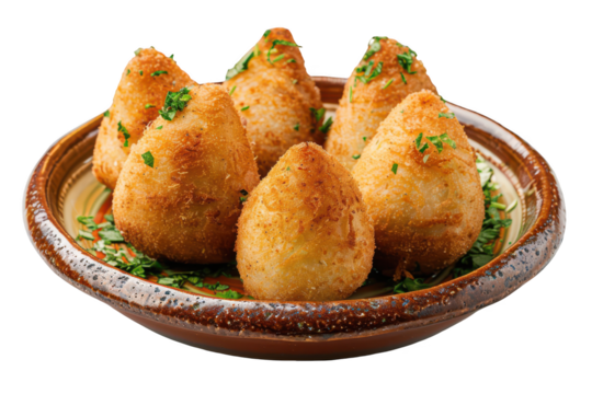 Crispy Brazil coxinha snack filled with shredded chicken croquettes and creamy cheese on wooden plate, isolated on white transparent background, concept of South American Cuisine
