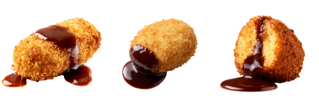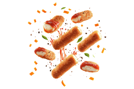 Fried croquettes with cheese and ketchup sauce floating in the air isolated on white or transparent, PNG