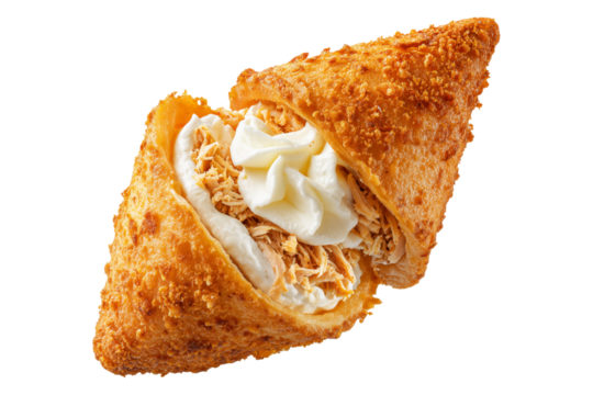 Crispy Brazil coxinha snack filled with shredded chicken croquettes and creamy cheese, isolated on white transparent background